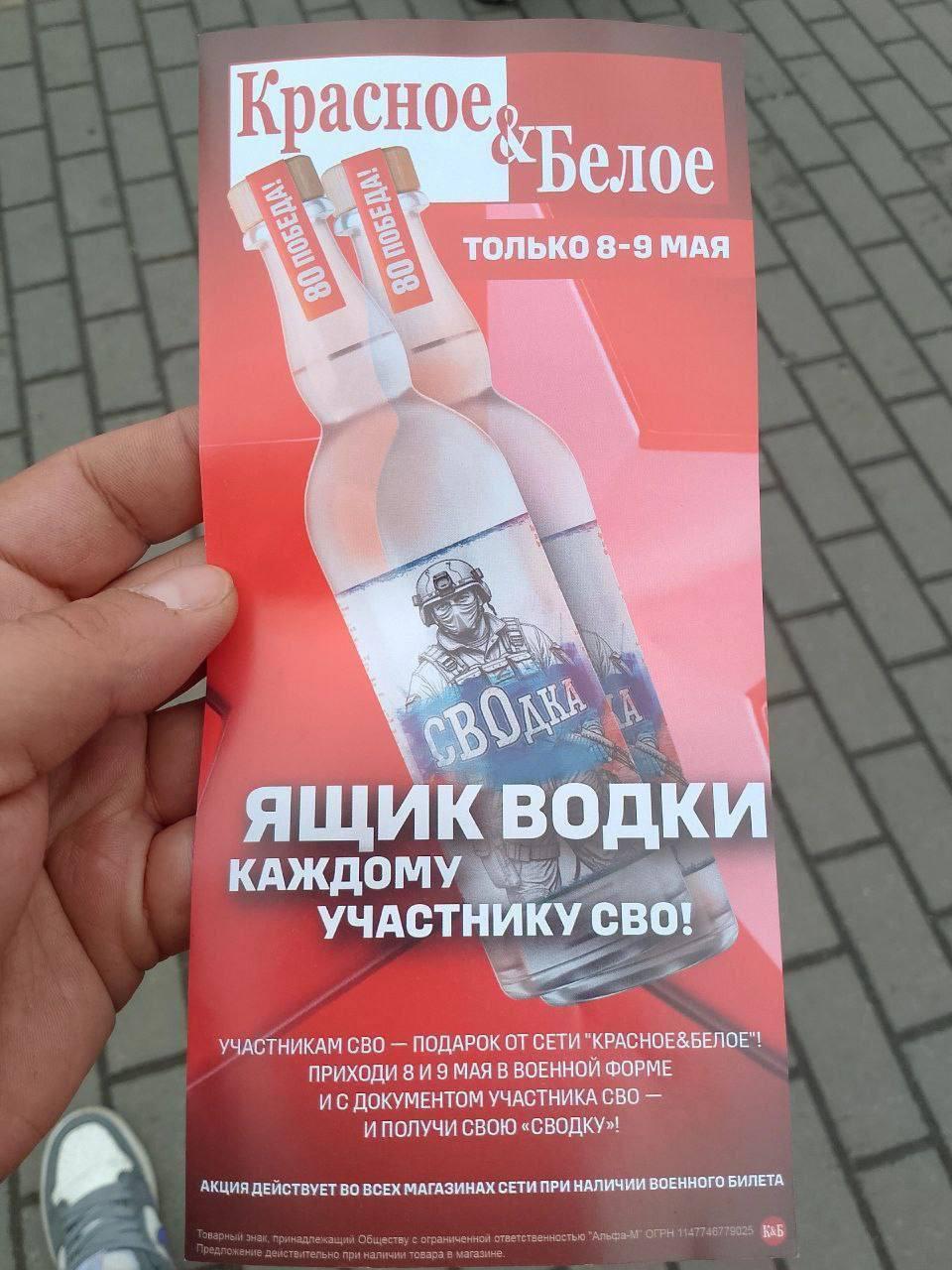 В России придумали, как порадовать своих «героев» СВО: в магазинах сети «Красное & Белое» 8–9 мая каждому участнику войны против Украины подарят ящик водки.