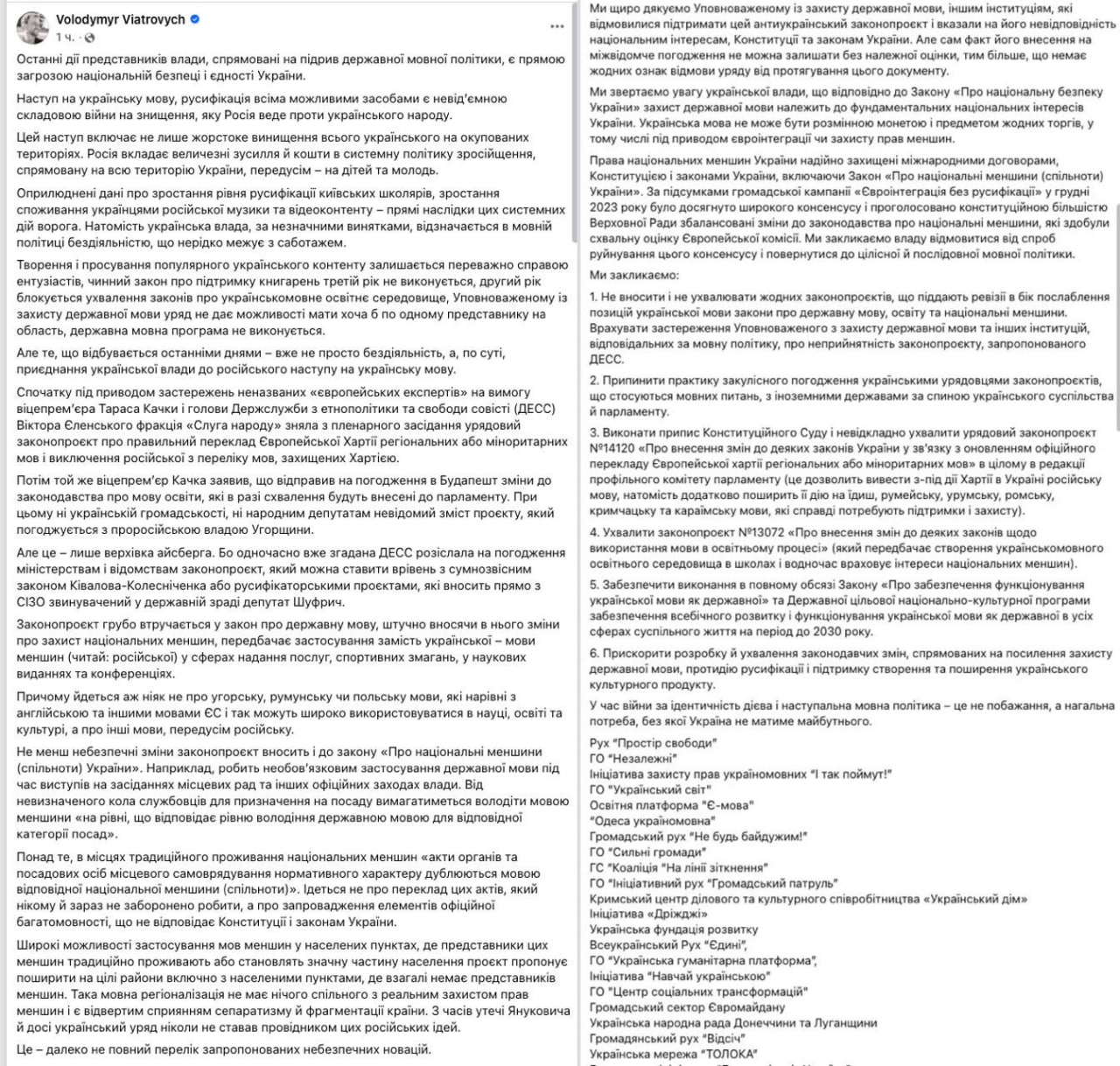 По словам Вятровича, такие положения создают риски фактического введения элементов официального многоязычия, что противоречит Конституции Украины. Особую обеспокоенность вызывает то, что действие проекта может распространяться на целые районы, где представители национальных меньшинств даже не проживают.