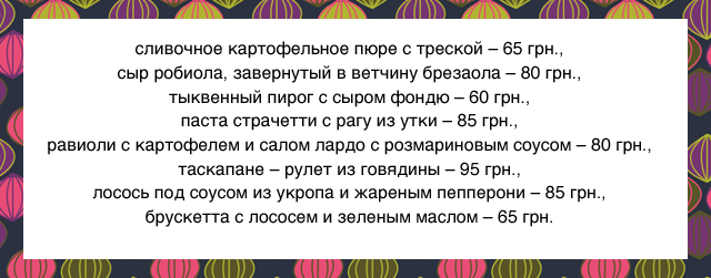 Десертная карта обозначена на отметке 50 грн.: яблочный пирог, тирамису, ванильная панна-котта, шоколадный фондан и замороженное суфле из белого шоколада, черники и сливок.
