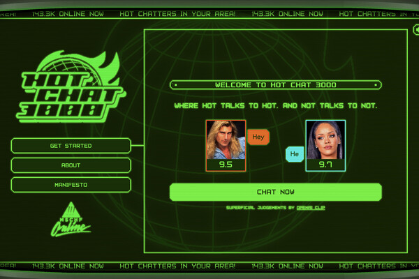 Теперь MSCHF выпустили проект под названием Hot Chat 3000. Сайт hotchat3000.com представляет собой фактически онлайн-чат в формате «один на один», где то, с кем вы разговариваете, зависит от того, насколько вы привлекательно выглядите по шкале от 1 до 10. Рейтинг красоты определяется искусственным интеллектом.