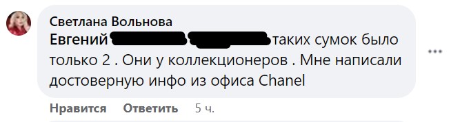 У коментарях під постом у Facebook Вольнова підкреслила, що їй написали достовірну інформацію з офісу Chanel. Представники бренду нібито сказали, що таких сумок було випущено лише два екземпляри і вони обидві знаходяться у колекціонерів.