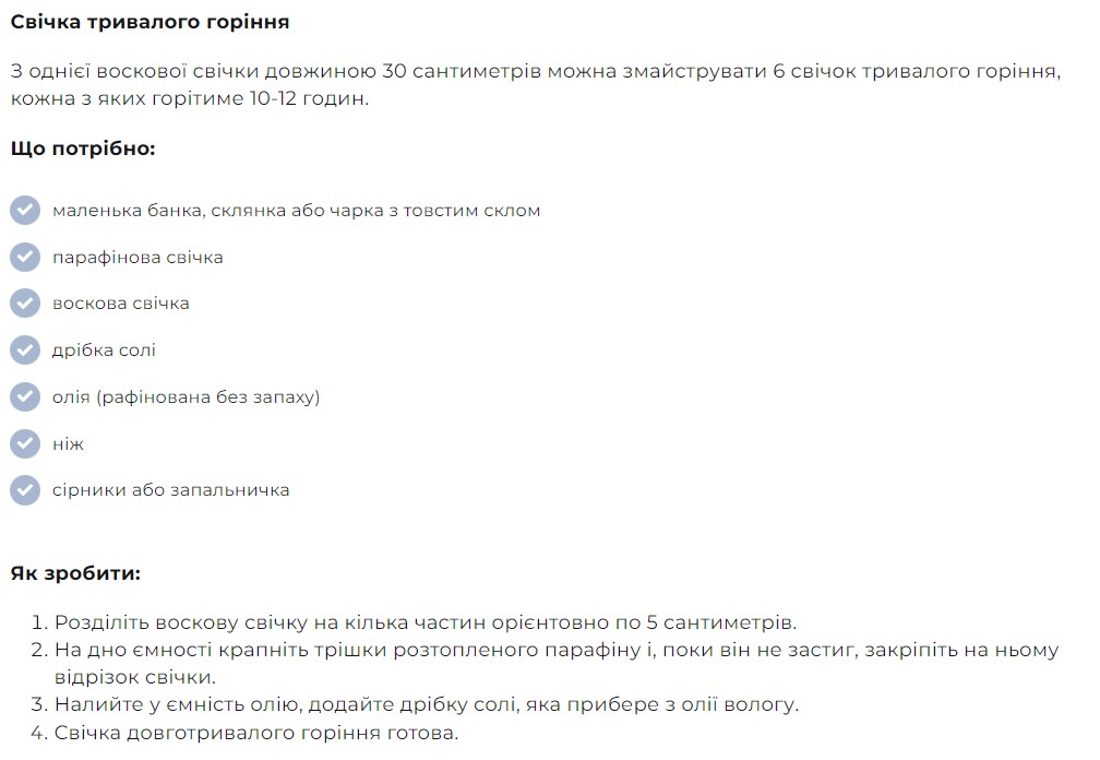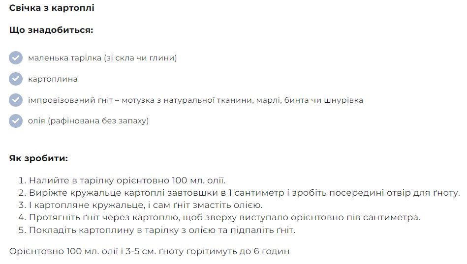 Саморобні свічки: створюються шість свічок тривалого горіння (10-12 годин) з однієї воскової свічки завдовжки 30 см та парафінової свічки, або можна створити свічку з картоплі.