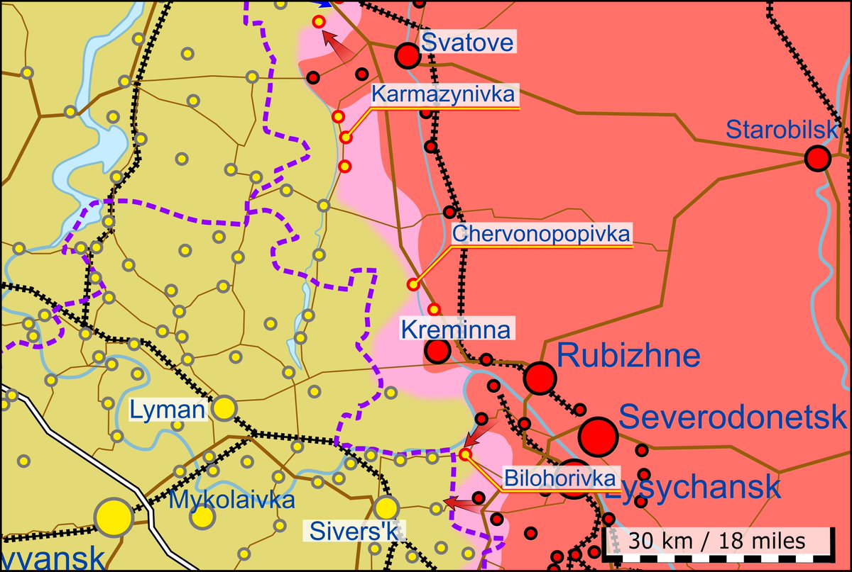 Повідомляється, що надіслані пункти Кармазинівка та Білогорівка (Луганська область) перебувають під інтенсивним тиском окупаційних військ, обидва селища на даний момент перебувають під контролем ЗСУ.