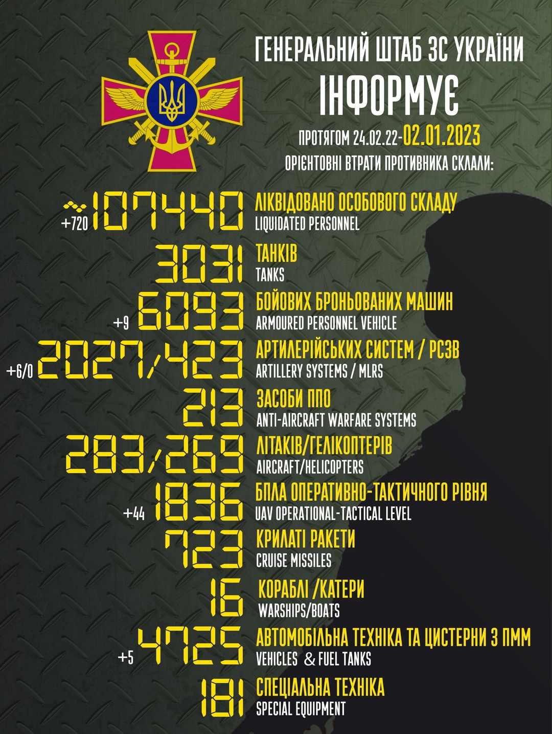 - Минулої доби Сили оборони України знищили ще 720 окупантів на нашій землі. Орієнтовні втрати армії РФ на 2 січня становлять: