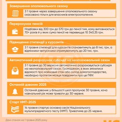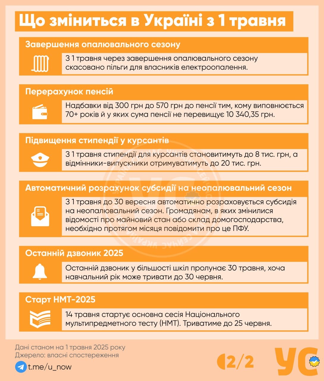 Новий місяць принесе зміни у різних сферах життя. Telegram-канал «Украина Сейчас» підготував інфографіку подій та нововведень, які набудуть чинності з 1 травня 2025 року.