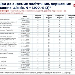 За результатами опитування, Валерію Залужному повністю довіряють 33% респондентів (ще 37% скоріше довіряють). Кирилу Буданову повністю довіряють 29%, частково 36% опитаних. Повну довіру Володимиру Зеленському висловили 24% учасників опитування, ще 34% скоріше довіряють йому.