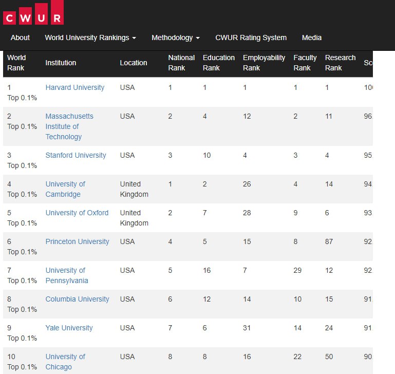 Цього року абсолютним лідером рейтингу став Гарвардський університет. Фактично перша десятка залишається незмінною вже багато років. Однак позиції у цій десятці можуть змінюватись.