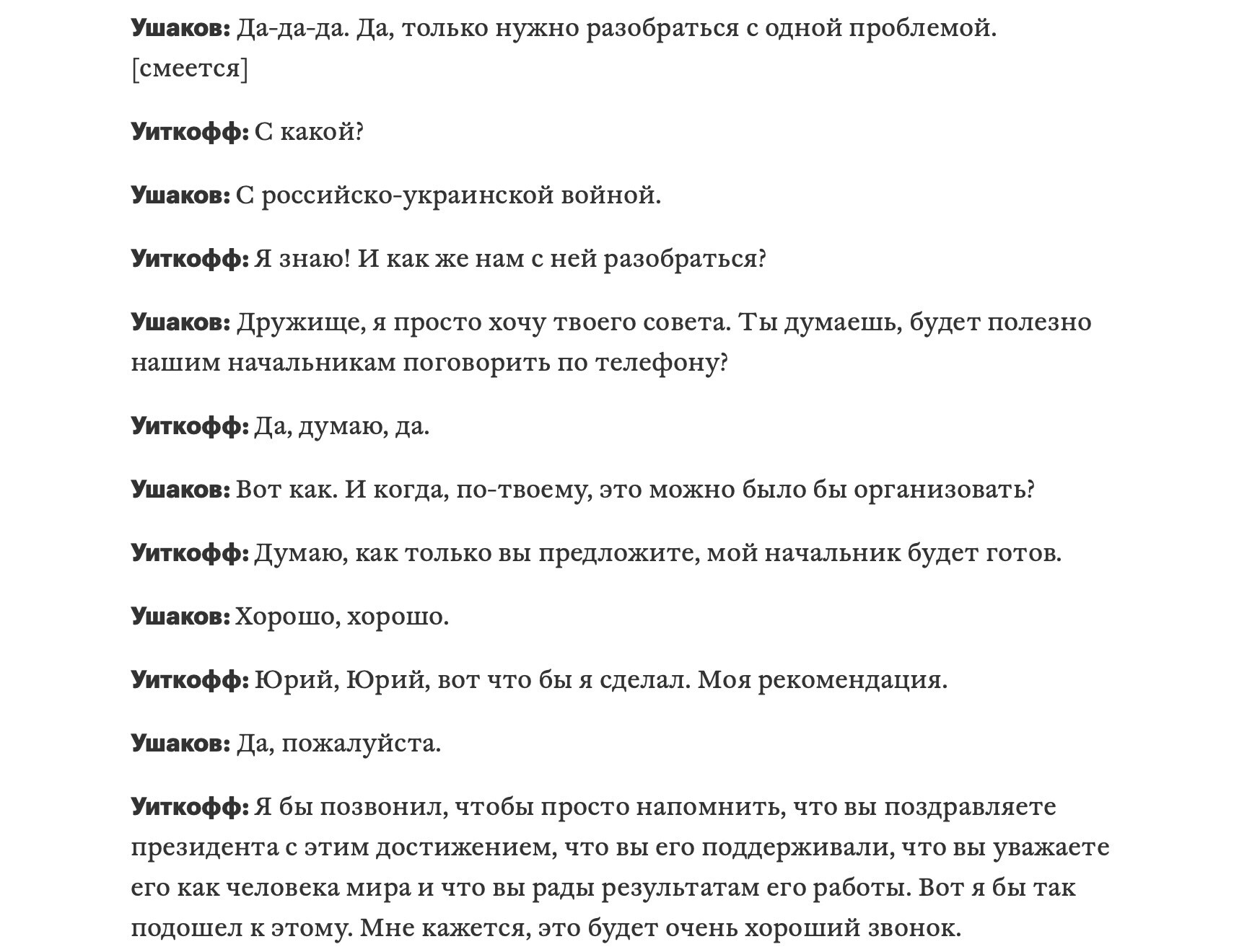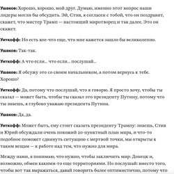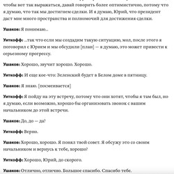 Друга злита розмова відбулася 29 жовтня — перед публікацією "американського" мирного плану щодо України. Він був між Ушаковим та російським посланником Кирилом Дмитрієвим. Вони обговорювали, що Дмитрієв передасть Віткоффу розроблений мирний план, але Ушаков побоювався, що США можуть змінити його не на користь РФ.
