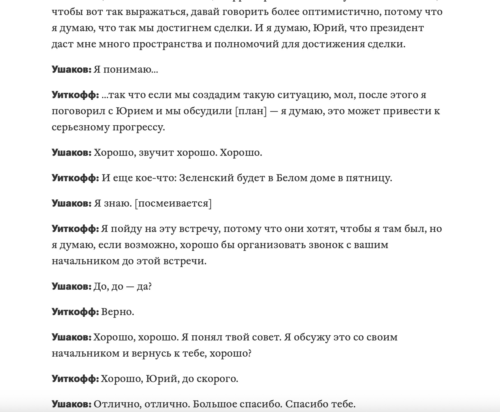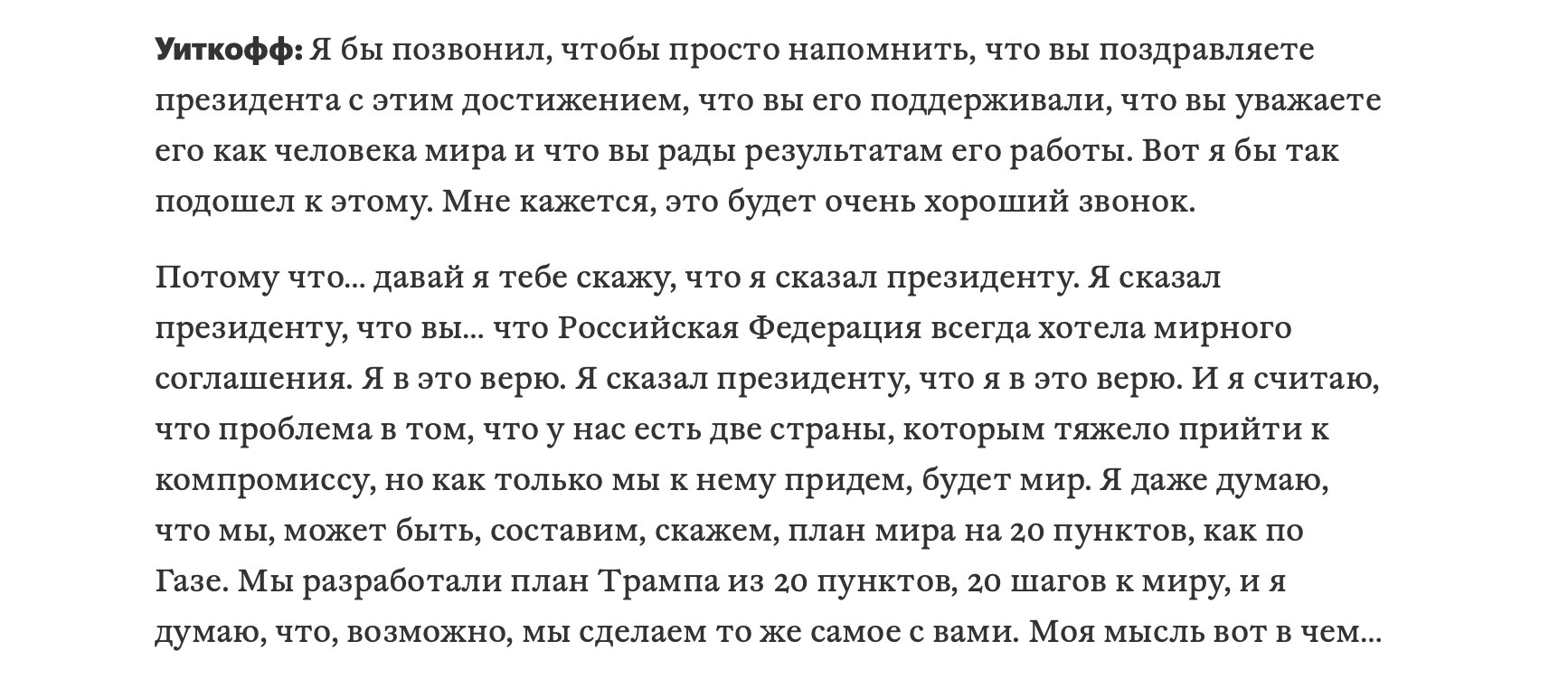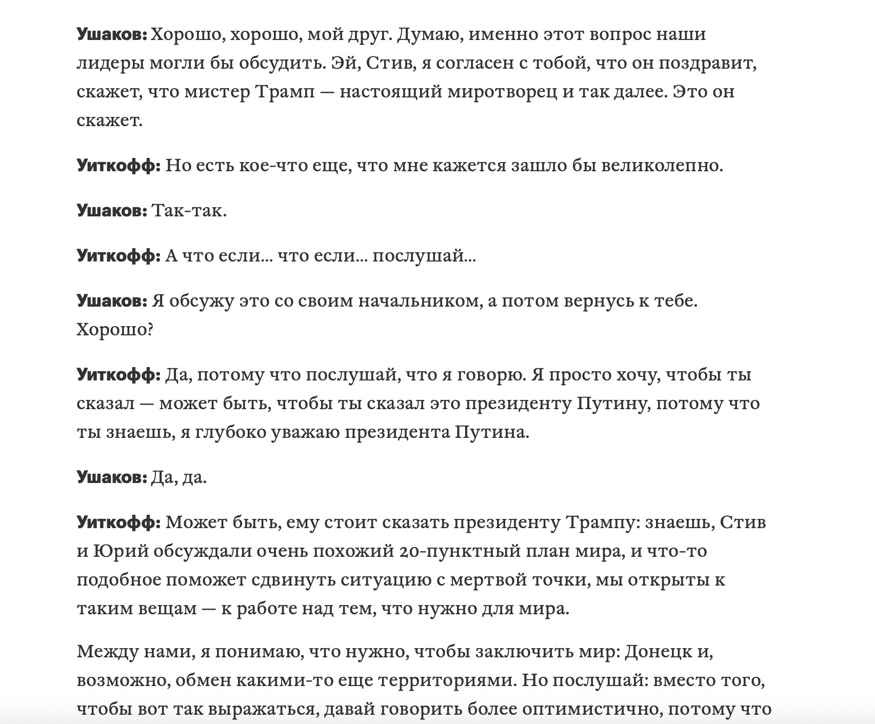 «[Подібні переговори] — це звичайна річ. [Віткоффу] потрібно „продати“ це Україні, йому потрібно „продати“ Україну Росії. Це те, чим займається майстер угод. <…> Я сам не чув запису, але, наскільки знаю, це були звичайні переговори. І я можу собі уявити, що він говорить те саме Україні, бо обидві сторони мають чимось жертвувати і щось отримувати».
