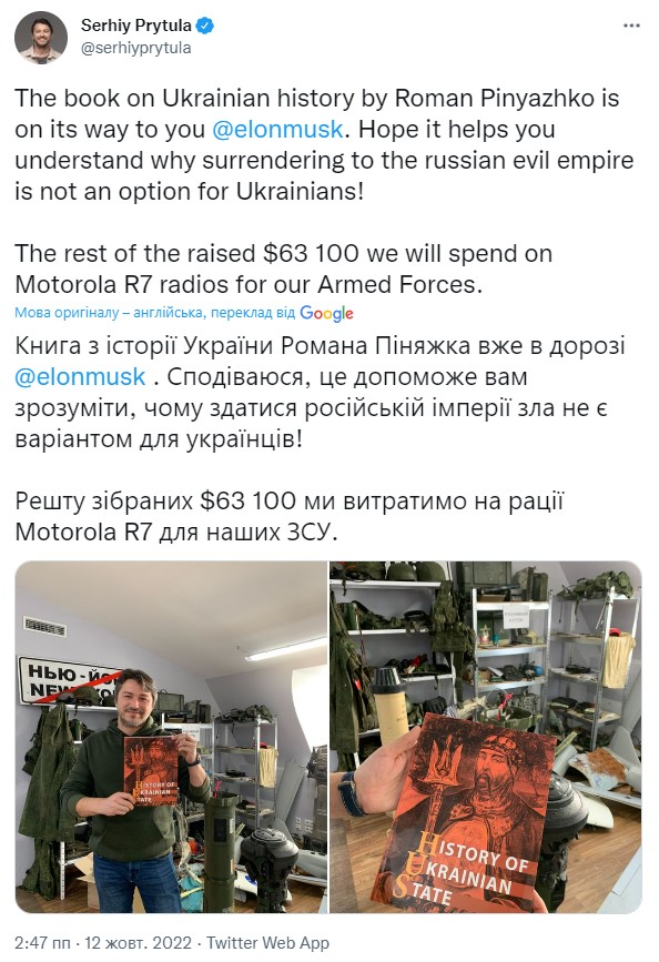 12 жовтня Притула показав фото з книгою з історії під назвою "Історія Держави Української" англійською мовою, написаною доцентом Романом Піняжком та опублікованою у 2015 році. Шоумен та волонтер додав, що друковане видання вже в дорозі. Він сподівається, що ця книга допоможе Ілону Маску зрозуміти, чому українці не можуть здатися "російській імперії зла".