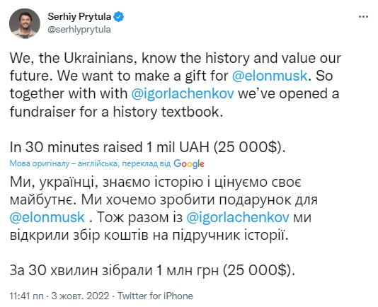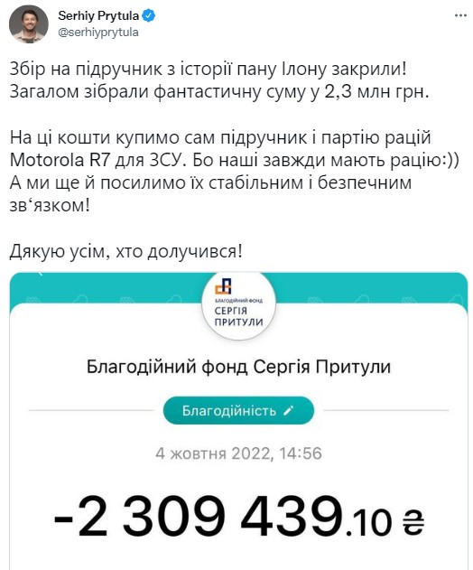 На тлі цього в мережі розпочався скандал, Ілон Маск отримав міжнародну увагу, а український шоумен Сергій Притула разом із автором Telegram-каналу "Лачен" Ігорем Лаченковим вирішили запустити збір на підручник з "Історії України" для голови SpaceX.
