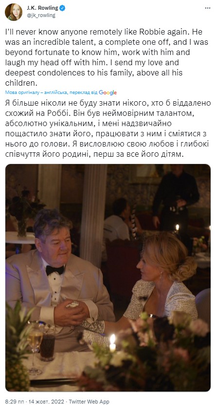 Письменниця романів про Гаррі Поттера Джоан Роулінг написала співчуття у своєму твіттері, додавши, що він був неймовірно талановитою та унікальною людиною, а їй пощастило знати його, працювати та сміятися з ним.