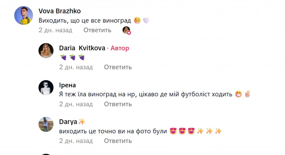 "Виходить, що це все виноград", – написав футболіст, а Даша поставила лайк на його коментар і відповіла емодзі у вигляді винограду.