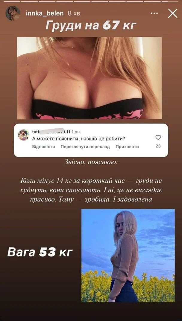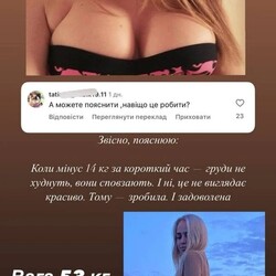 "Коли мінус 14 кг за короткий час – груди не худнуть, вони сповзають. І ні, це не має красивого вигляду. Тому зробила. І задоволена. Груди не лише втратили форму, а й стали асиметричні. Обожнюю своє тіло, але ні спортом, ні харчуванням груди не підтягнеш, на жаль. А я хочу ходити без бюстгальтера. Я хочу гуляти по квартирі голою і кайфувати від свого тіла", - розповіла блогер.